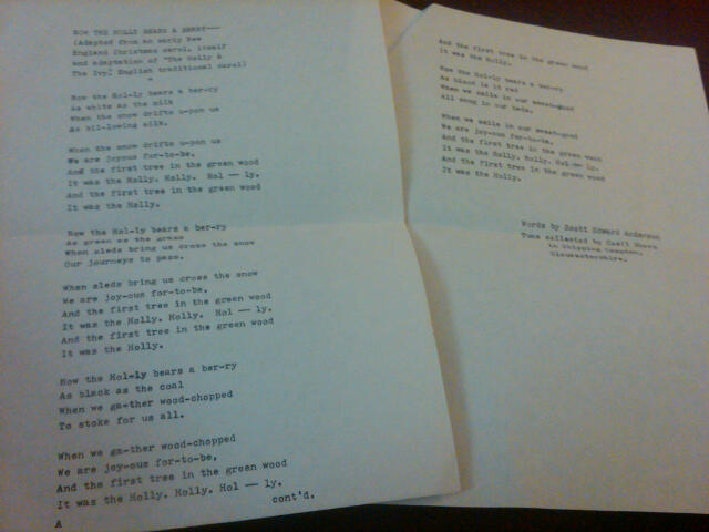 My 8-year-old daughter came across a couple of typewritten sheets of paper in a copy of The Penguin Book of Christmas Carols, edited by Elizabeth Poston.