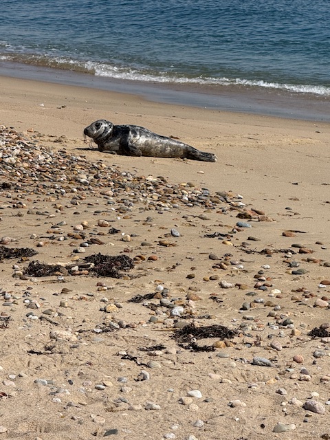 We had our own encounter with a stranded sea creature that weekend. Walking along the shore out near the North Light, we came across a juvenile gray seal tangled in fishing netting, the line wrapped tight around its neck — alive, but struggling. We called Mystic Aquarium across the Sound, who alerted the Block Island Maritime Institute, and a rescue team was mobilized.